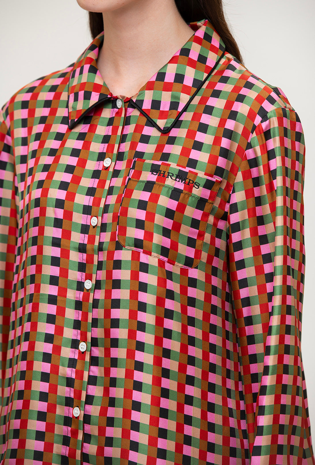 Introducing the Arley Pyjama Shirt for Resort ’25. Crafted from luxurious silk. with a multi-colour grid base and contrasting black piping.