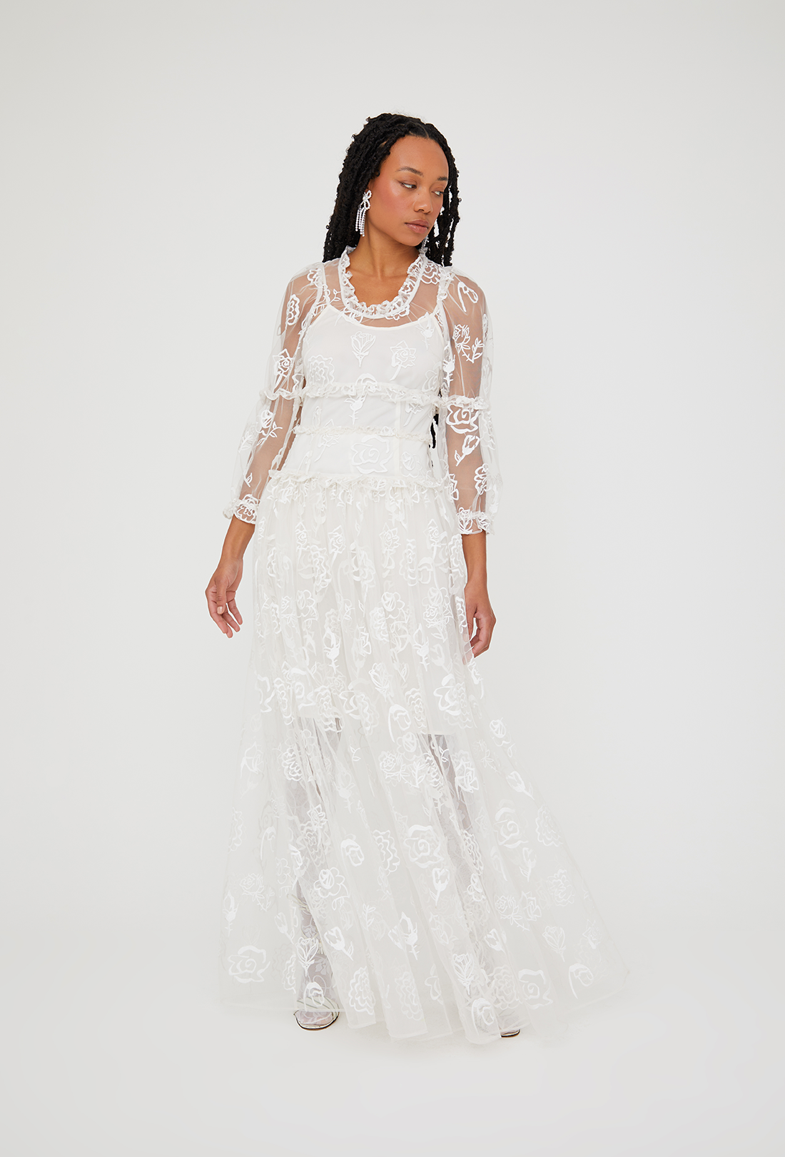Bringing back our Cara Dress as part of our Shrimps Bridal collection. Crafted from a luxurious organza with allover statement Shrimps embroidered roses. with a bias cut removable slip dress.