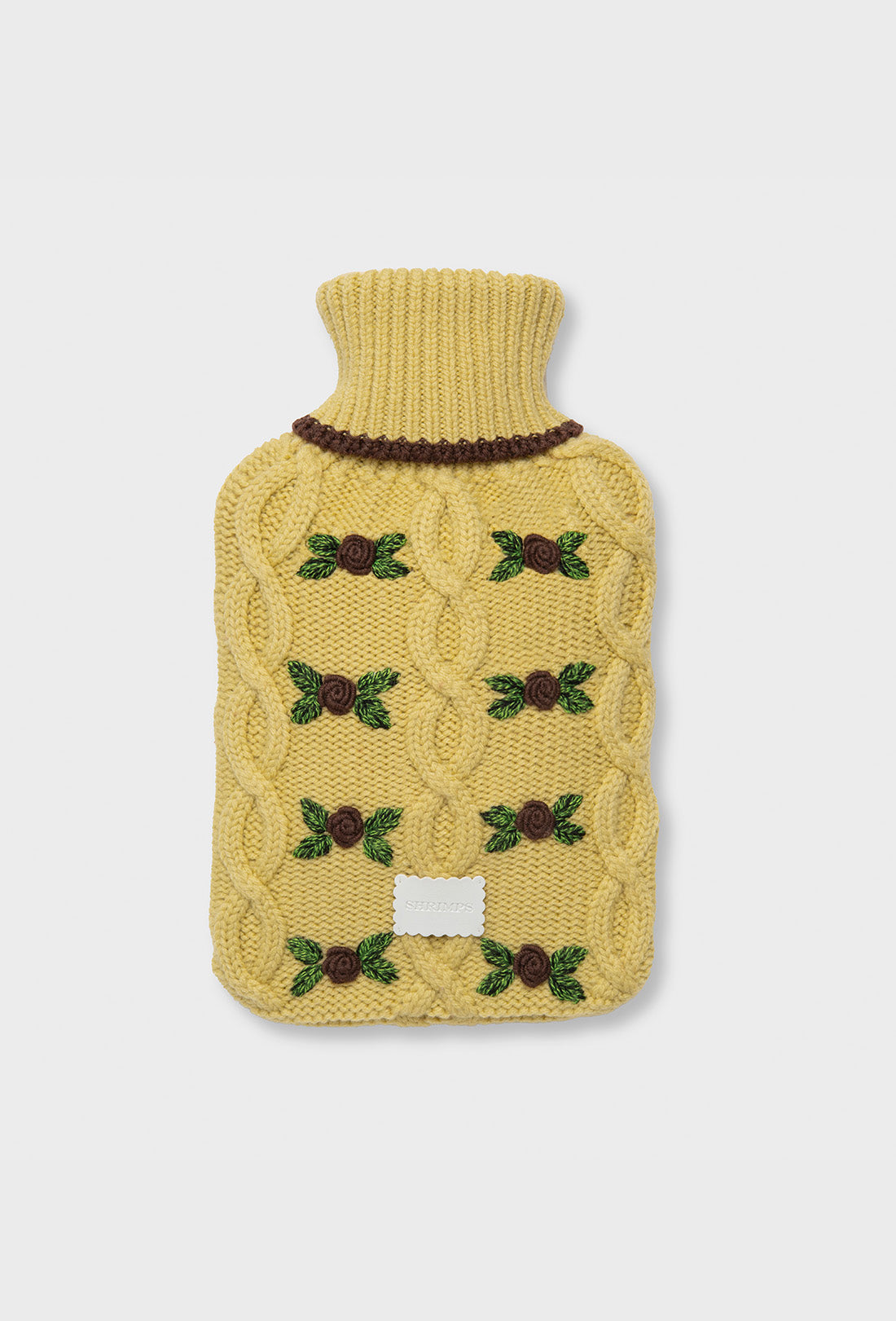 Introducing the Cecile Hot Water Bottle for Autumn Winter ’25. Crafted from super-soft merino wool. with a dusty yellow base and chocolate brown hand-embroidered roses.