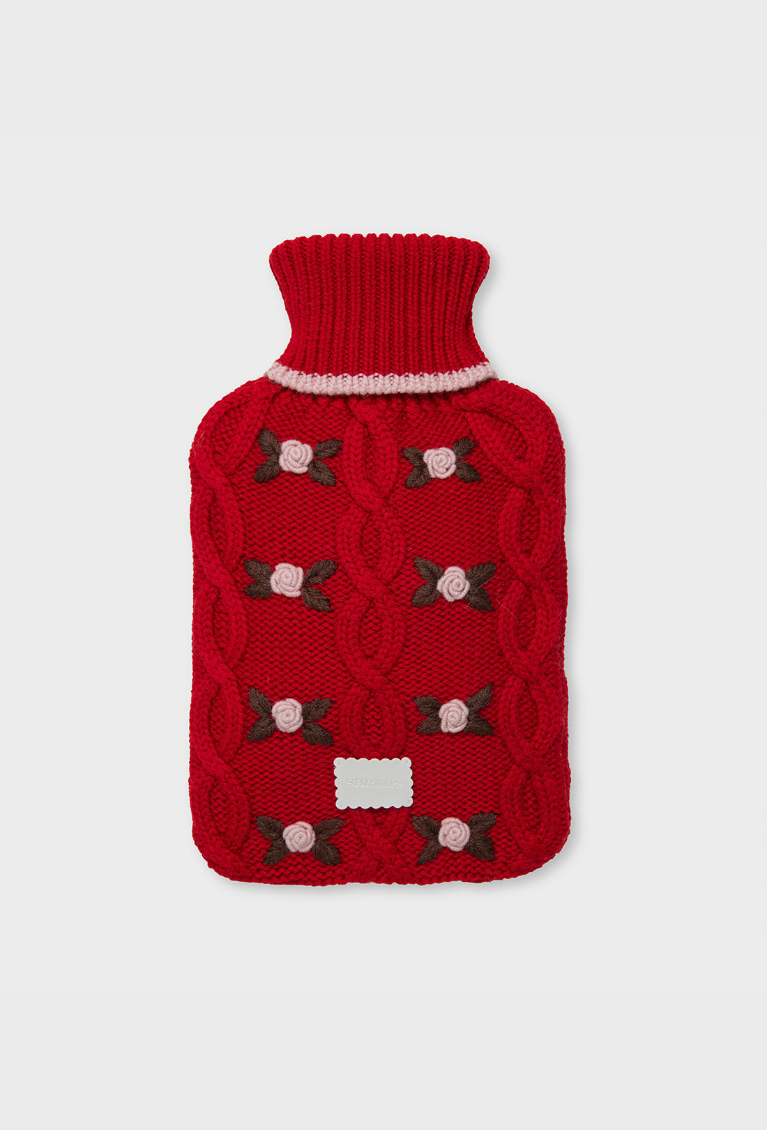 Introducing the Cecile Hot Water Bottle for Autumn Winter ’25. Crafted from super-soft merino wool. with a rose red base and pale pink hand-embroidered roses.