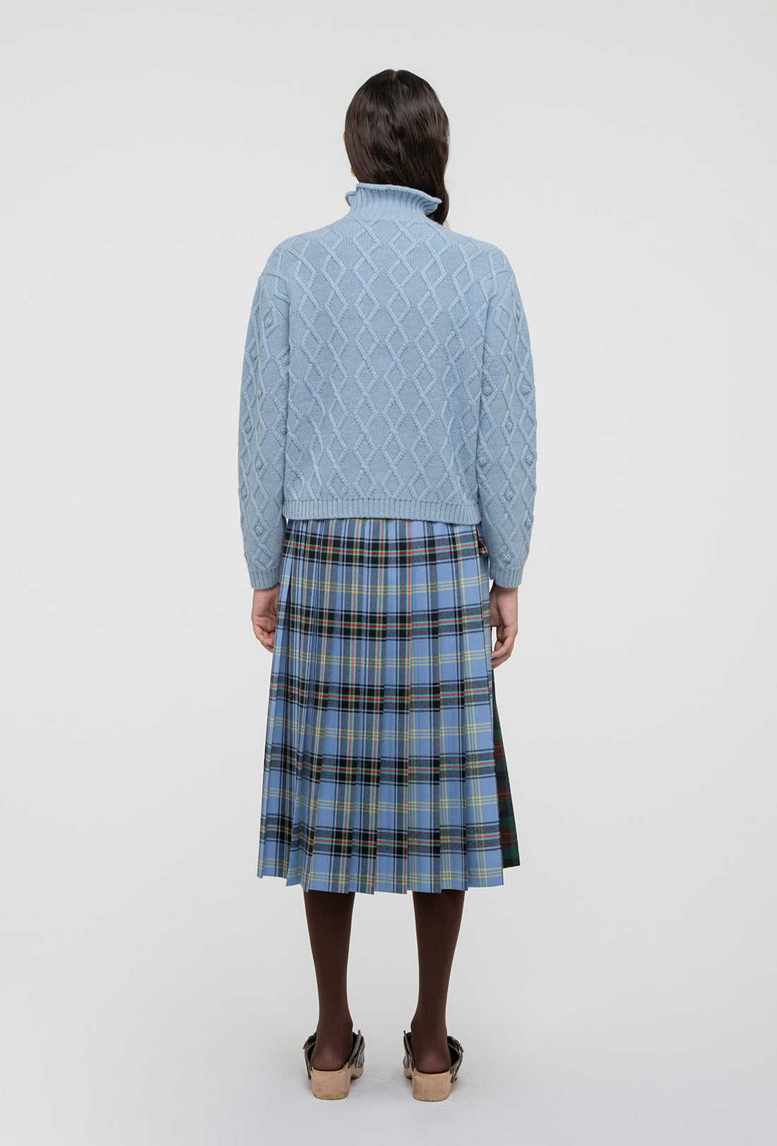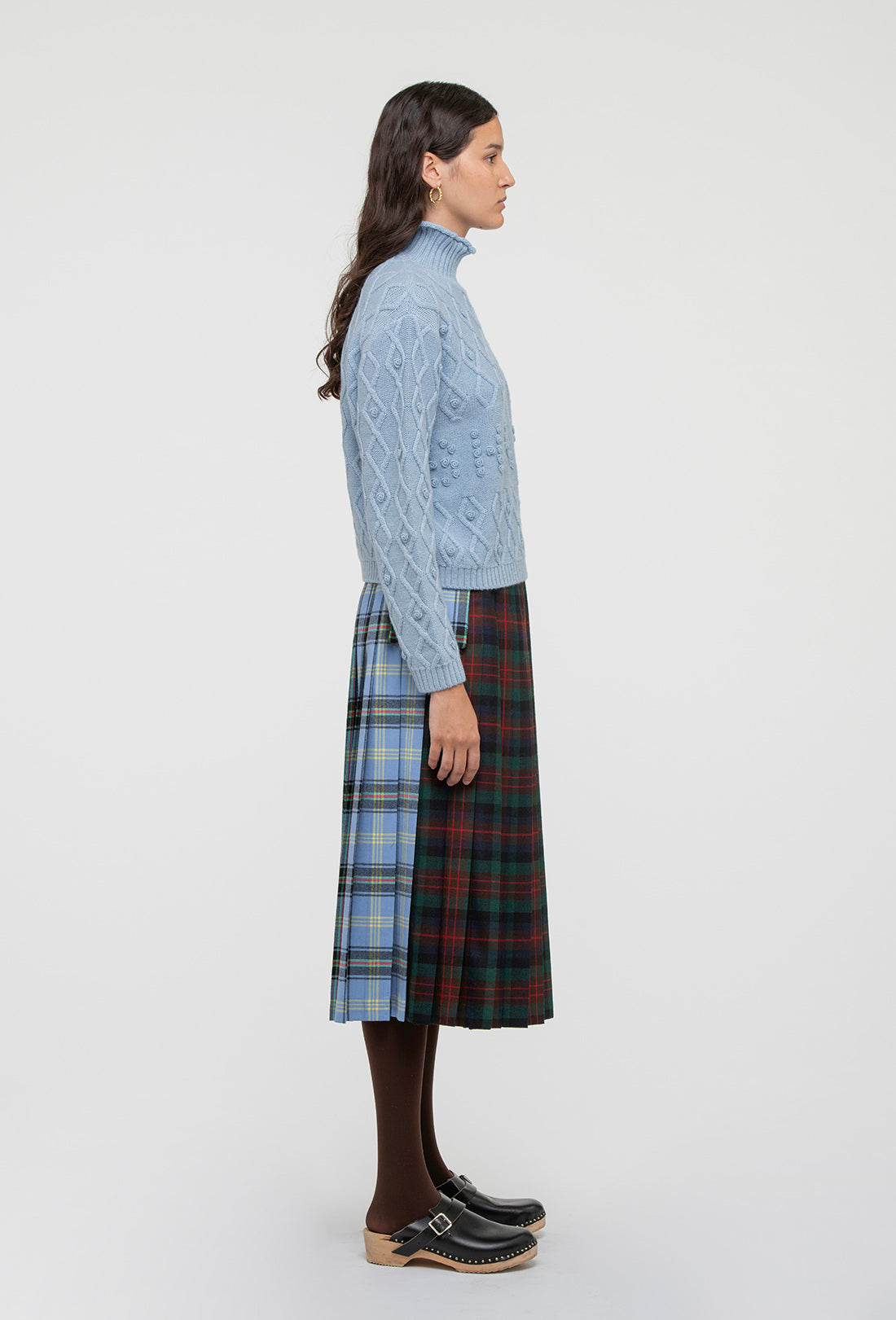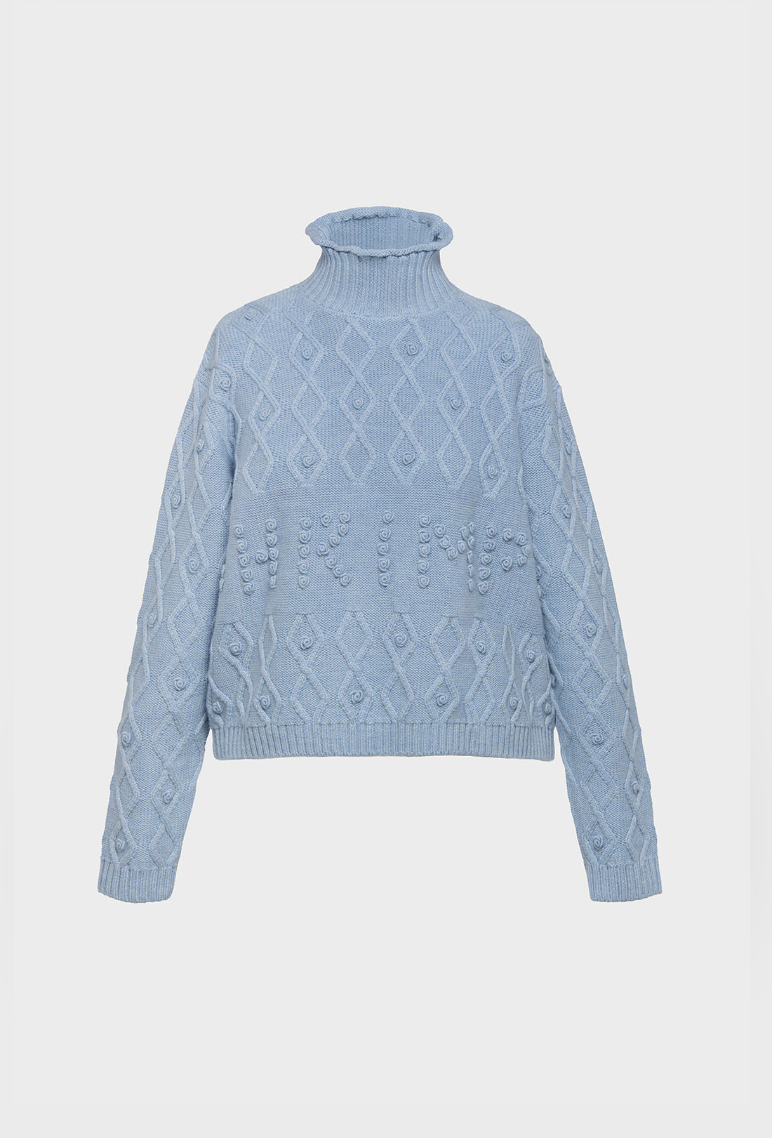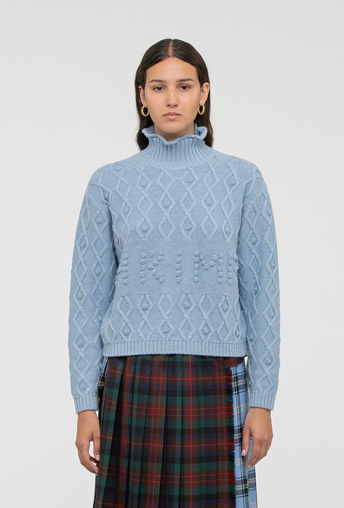 The Cornelia features chunky cable knit detailing. a high ribbed neckline. cuffs and hem and is finished with a front rectangular panel with ‘Shrimps’ written in roses.