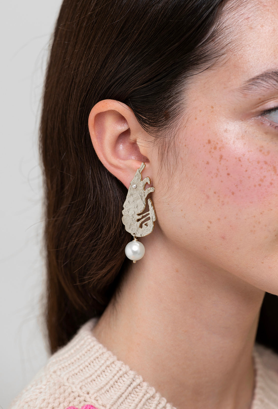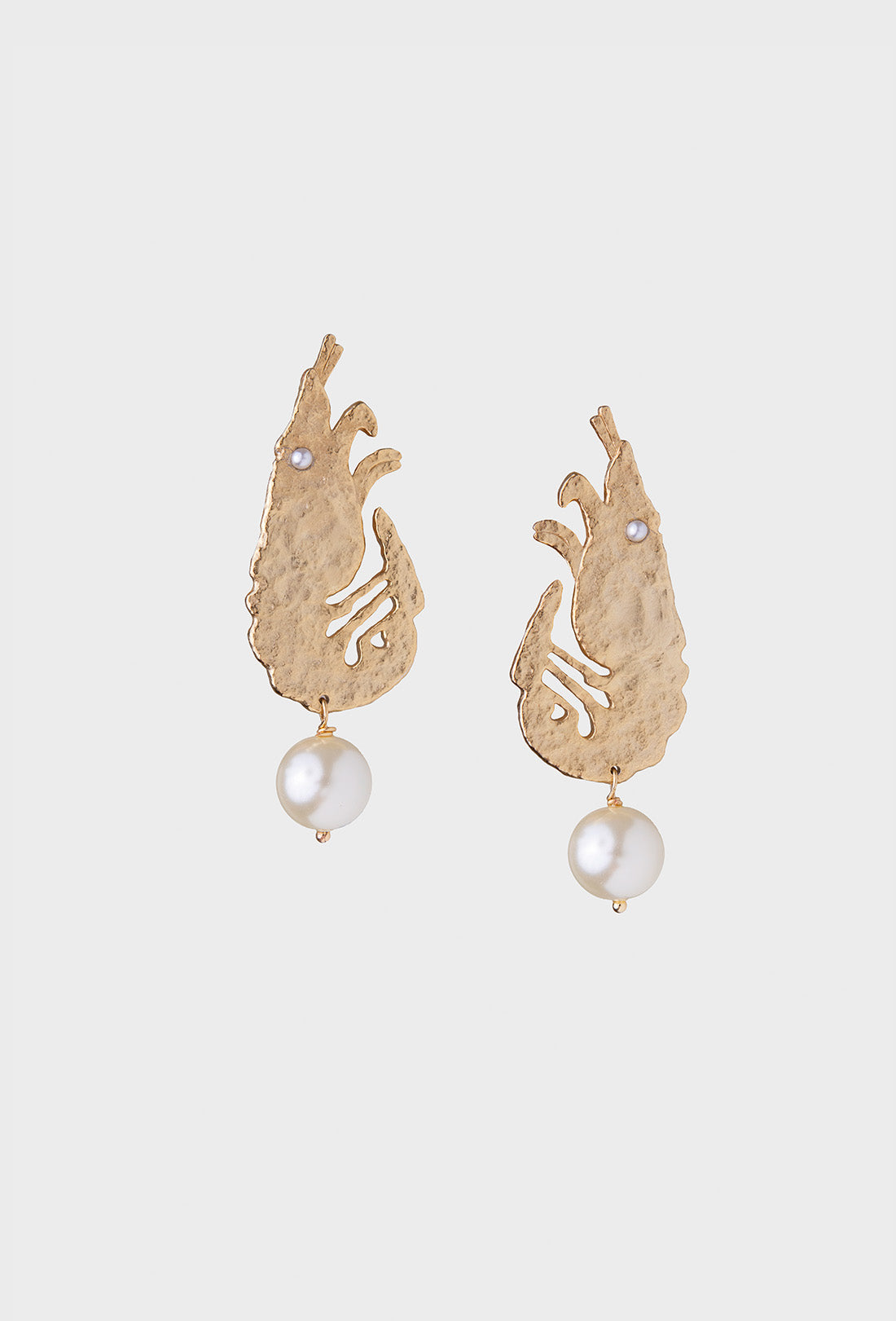 Introducing the Crevette Earrings from our Resort ’25 collection. Featuring an iconic flat hammered gold Shrimp motif with a single drop spherical faux pearl.