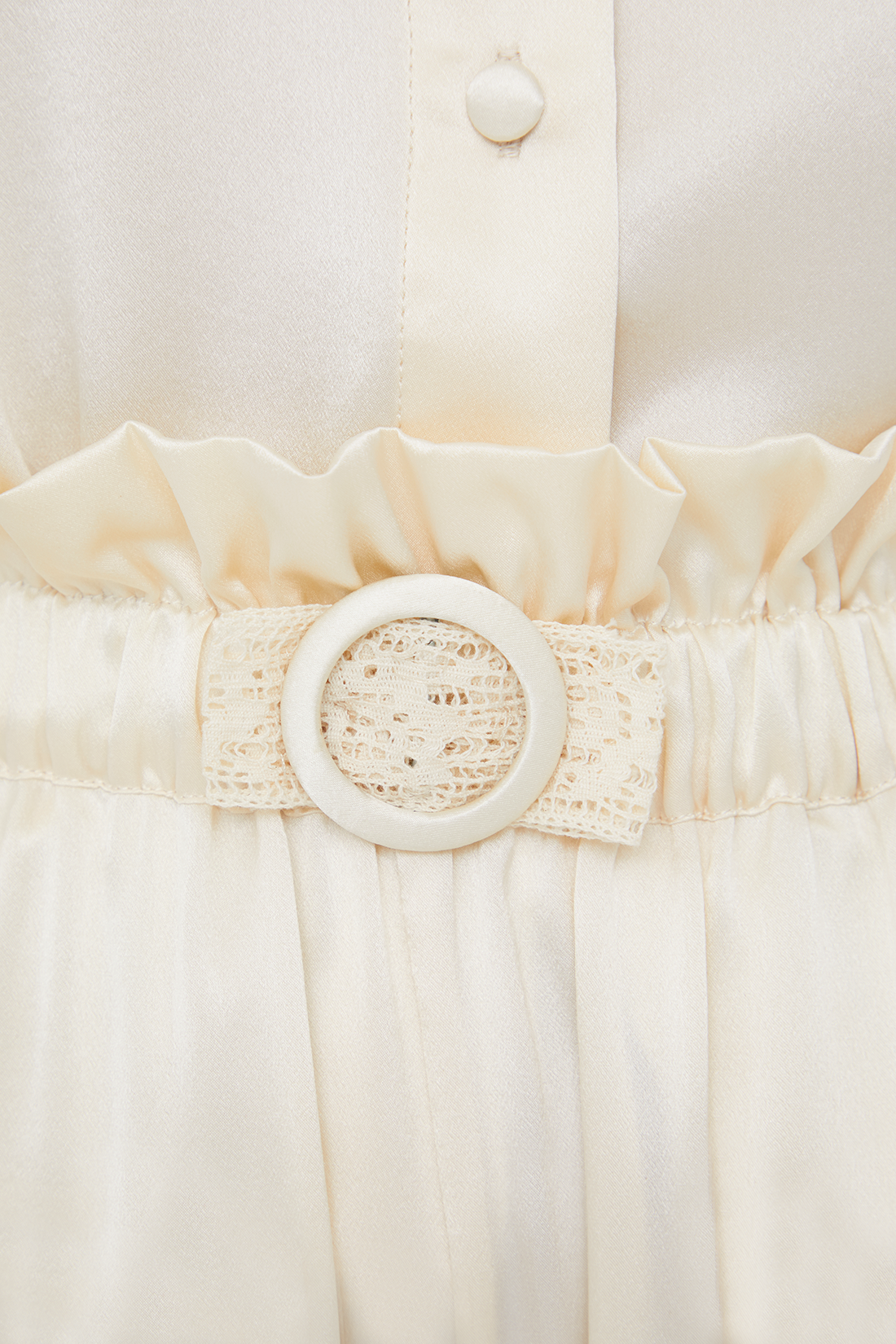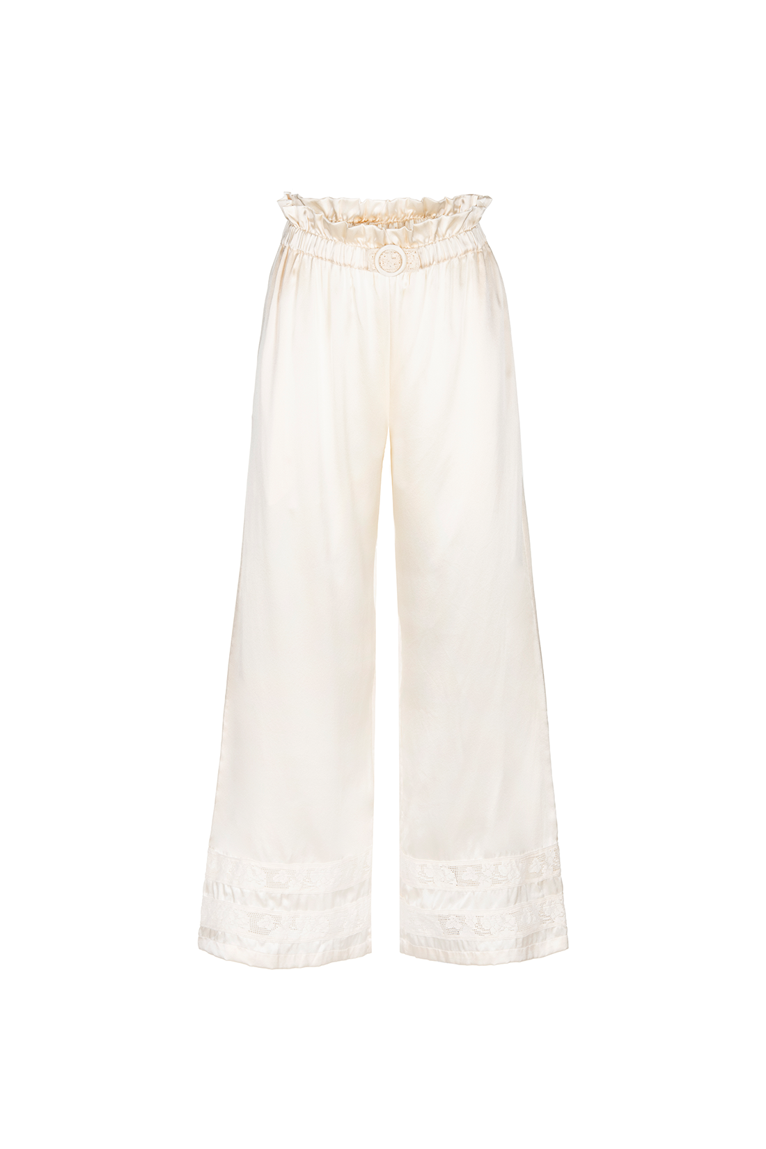 The Libra trousers are a wide-leg loose fitting style with an elasticated waist. The off-white cotton lace panelling provides a delicate contrast to the luxurious cream silk. Pair with the Clematis Blouse for a matching bridal set.