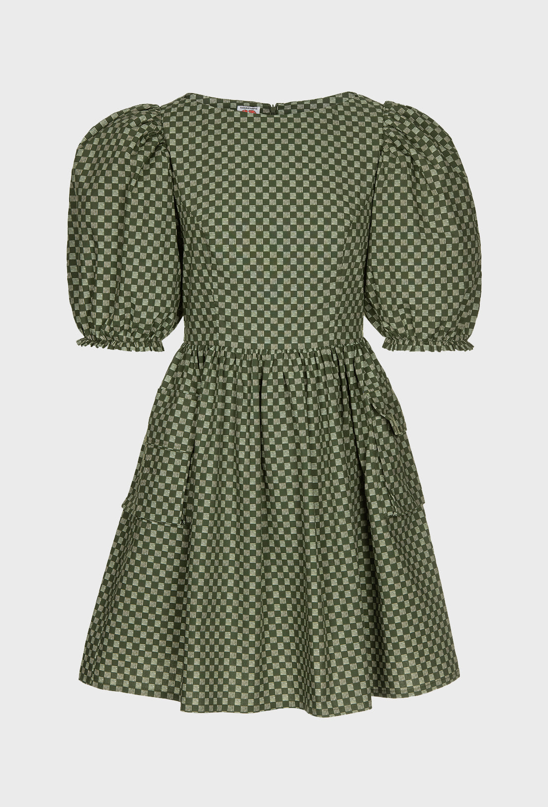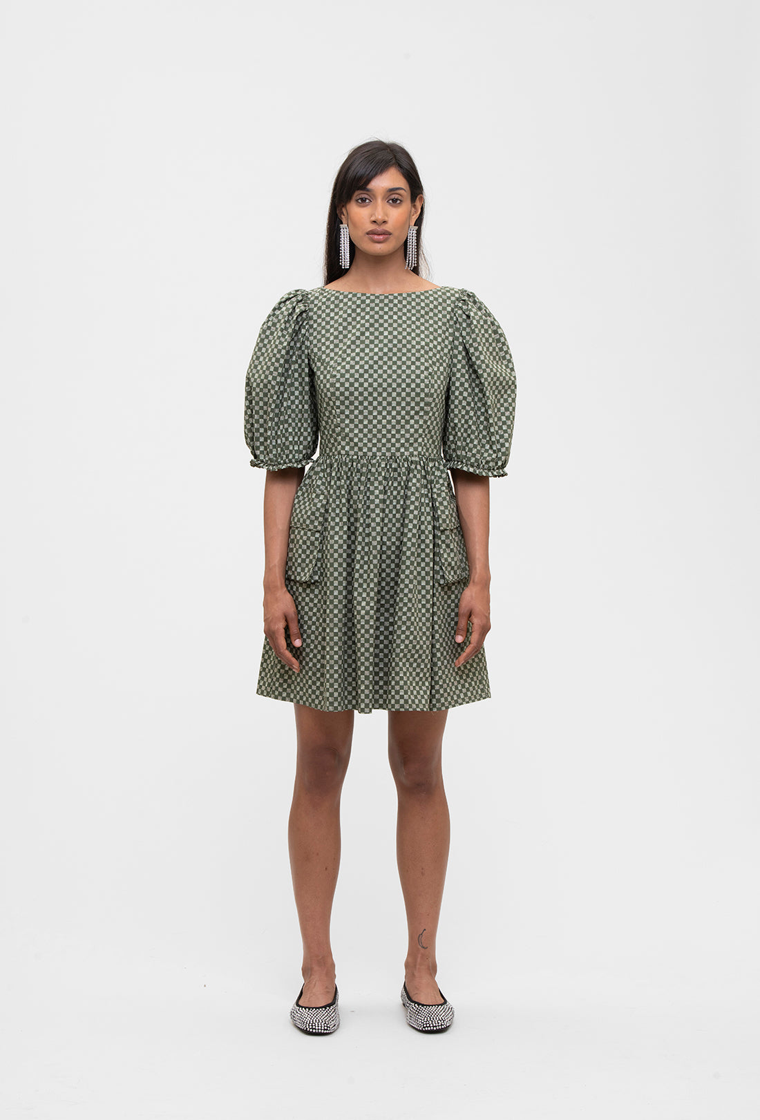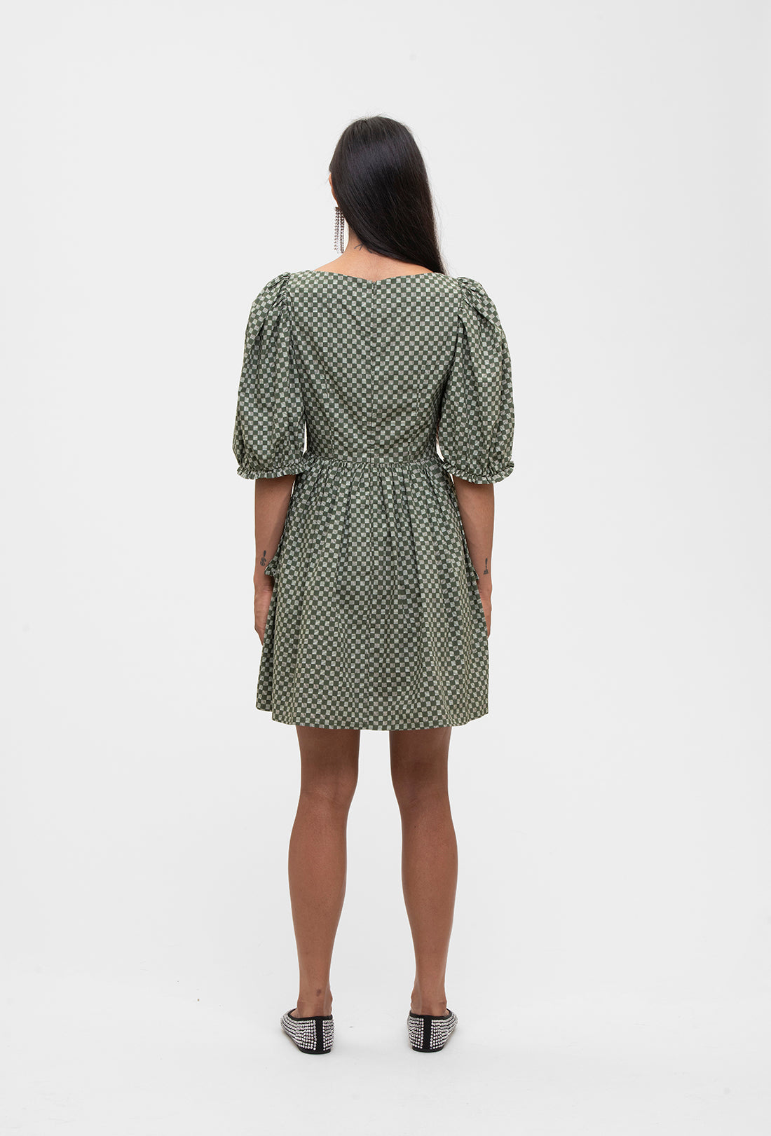 The March Dress comes in a beautiful chive and cream check print. featuring puff sleeves. a mini-length full skirt and a round neckline.