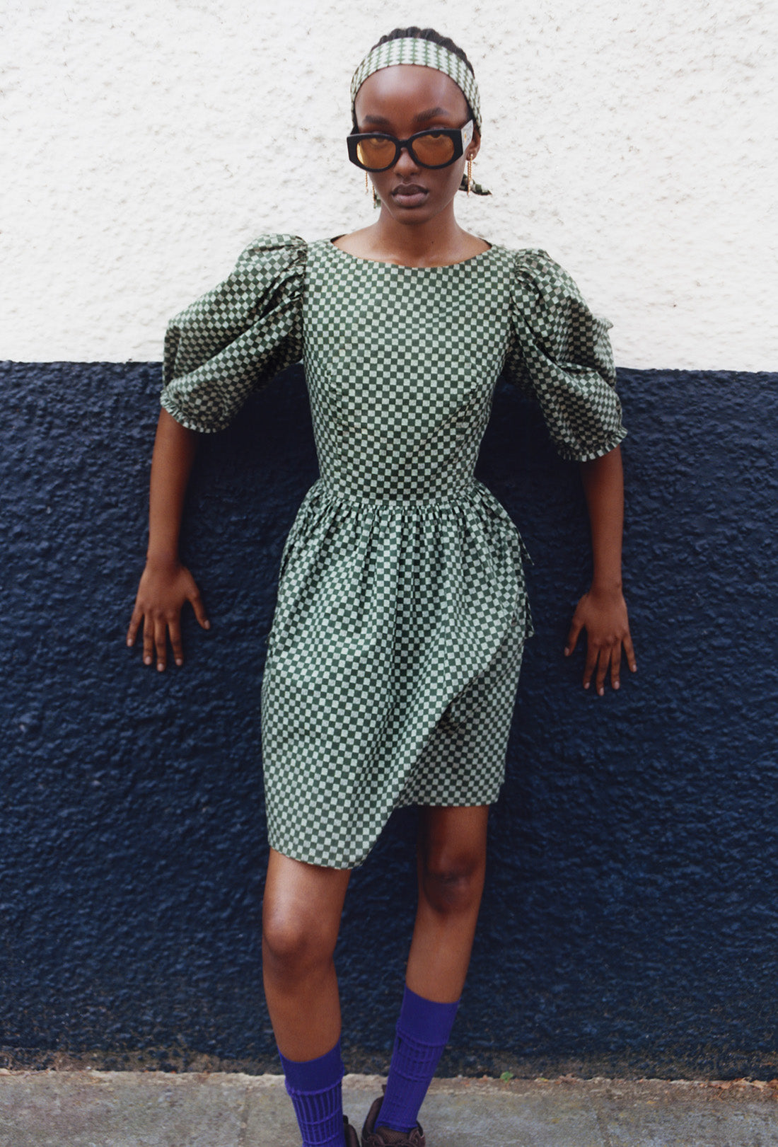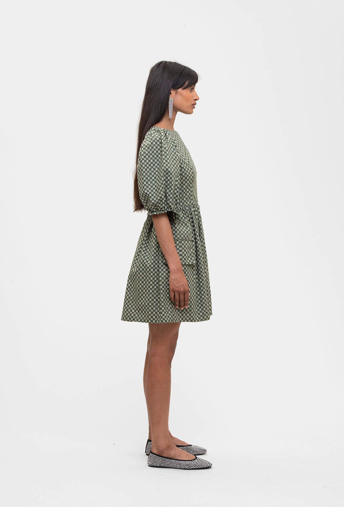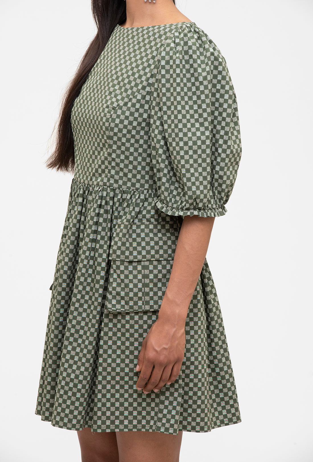 The March Dress comes in a beautiful chive and cream check print. featuring puff sleeves. a mini-length full skirt and a round neckline.