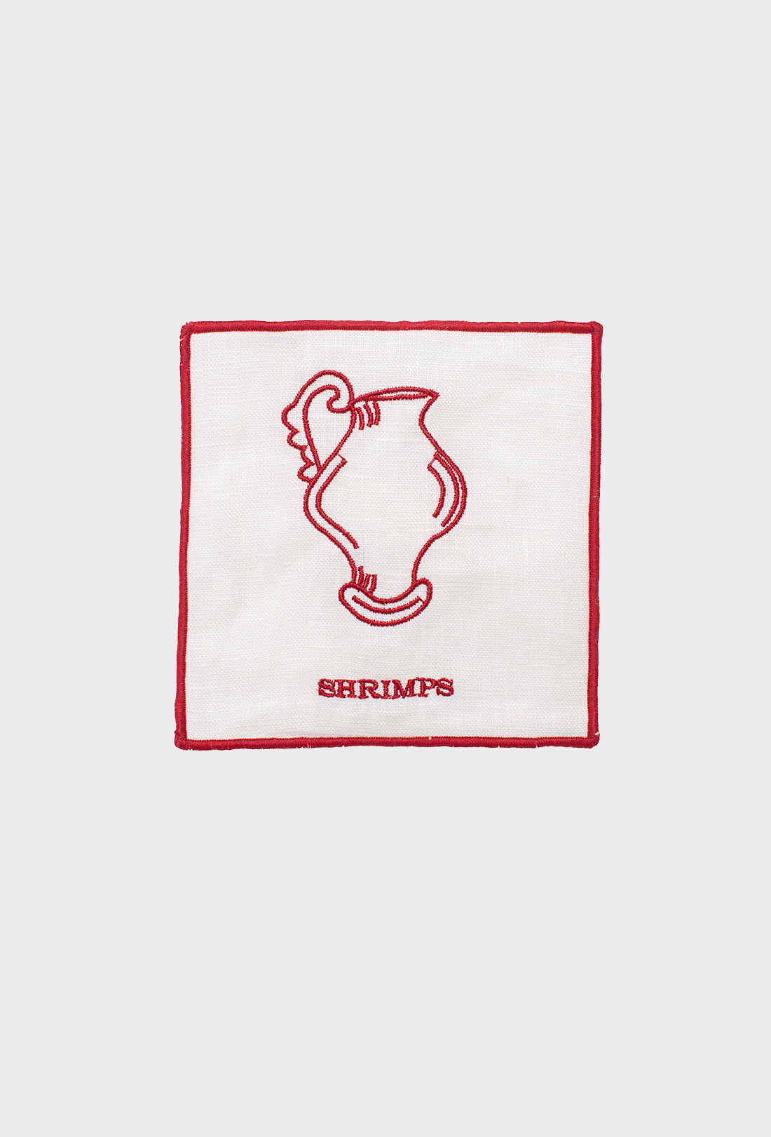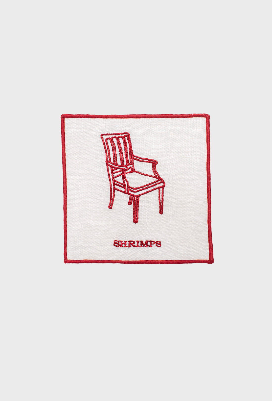 The Meadow Coasters feature four statement motifs; a vase. a bunch of cherries. a chair and a rose. all featuring the ‘Shrimps’ Logo with contrasting rose red edging.