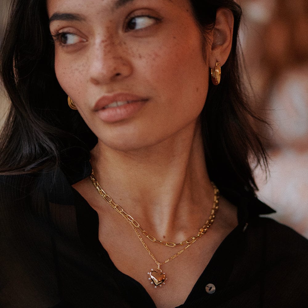 You’re going to love this one. Hung on a classic Figaro chain. this unique chubby heart charm is a sweet addition to your layering look. Styled solo or stacked. keep your heart in the right place